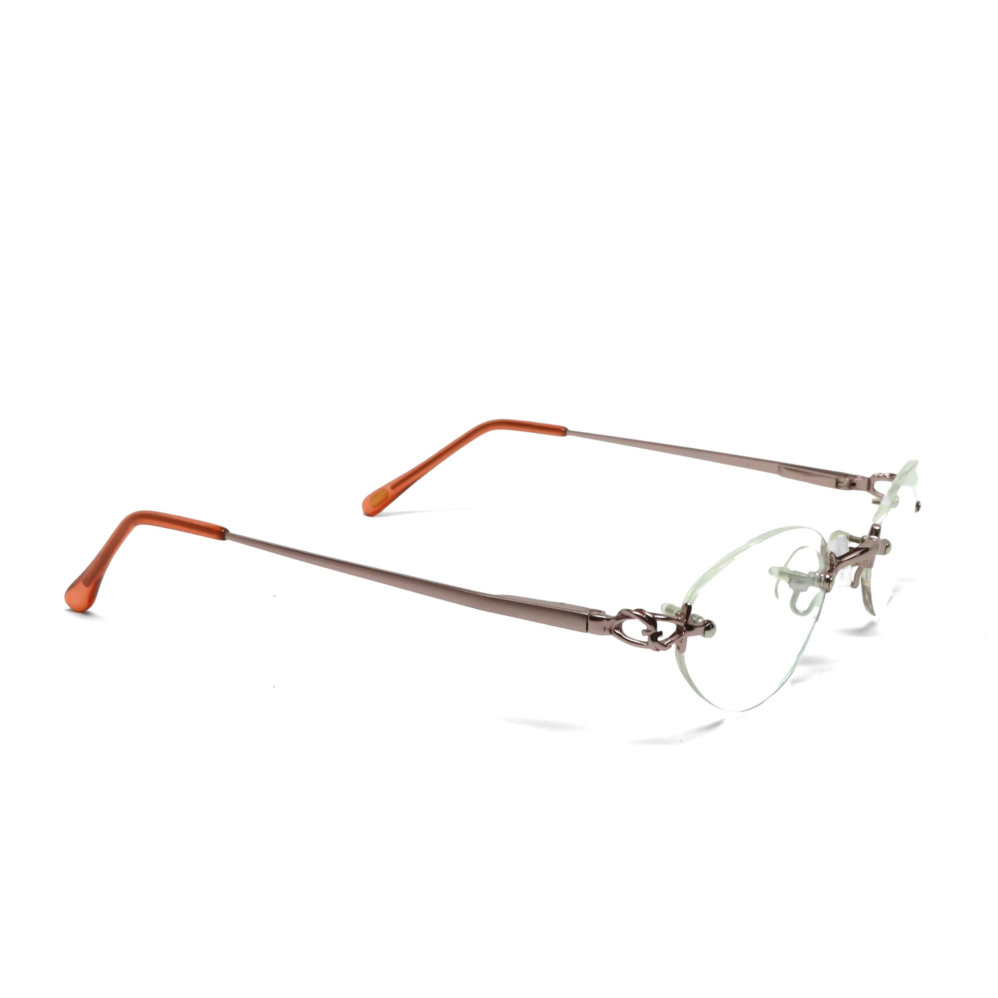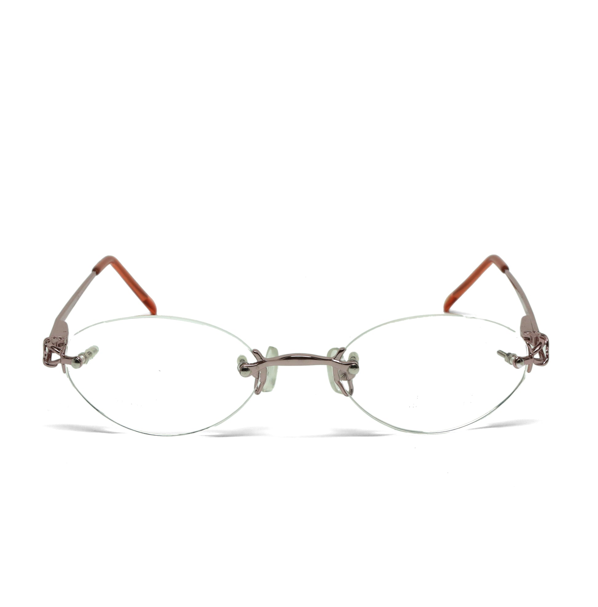 These high-quality 1990s spectacle glasses showcase sleek rimless metal frames with clear lenses. A rare vintage deadstock design, exclusively available at vivid_90s.